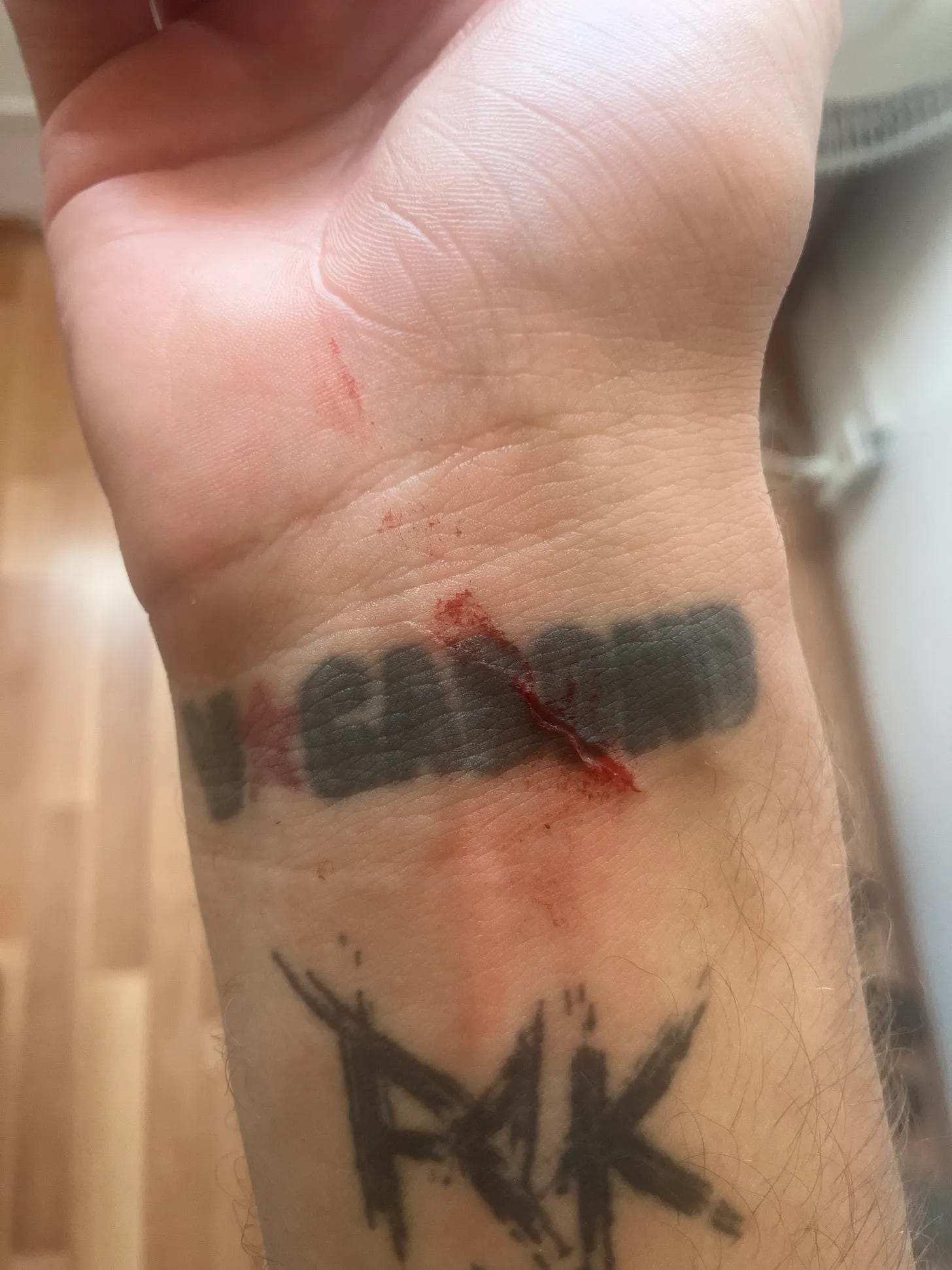 When we got home, I started packing my things. Suddenly, I noticed a red stain on my jeans pocket. I couldn’t figure out where it came from. And then I saw my bleeding wrist. The lettering “Vagabond,” which I had tattooed when I took my first trip to Mexico years ago, had a two-centimeter wound running through it, and blood was flowing from it. I don’t remember what I cut myself on or when.
