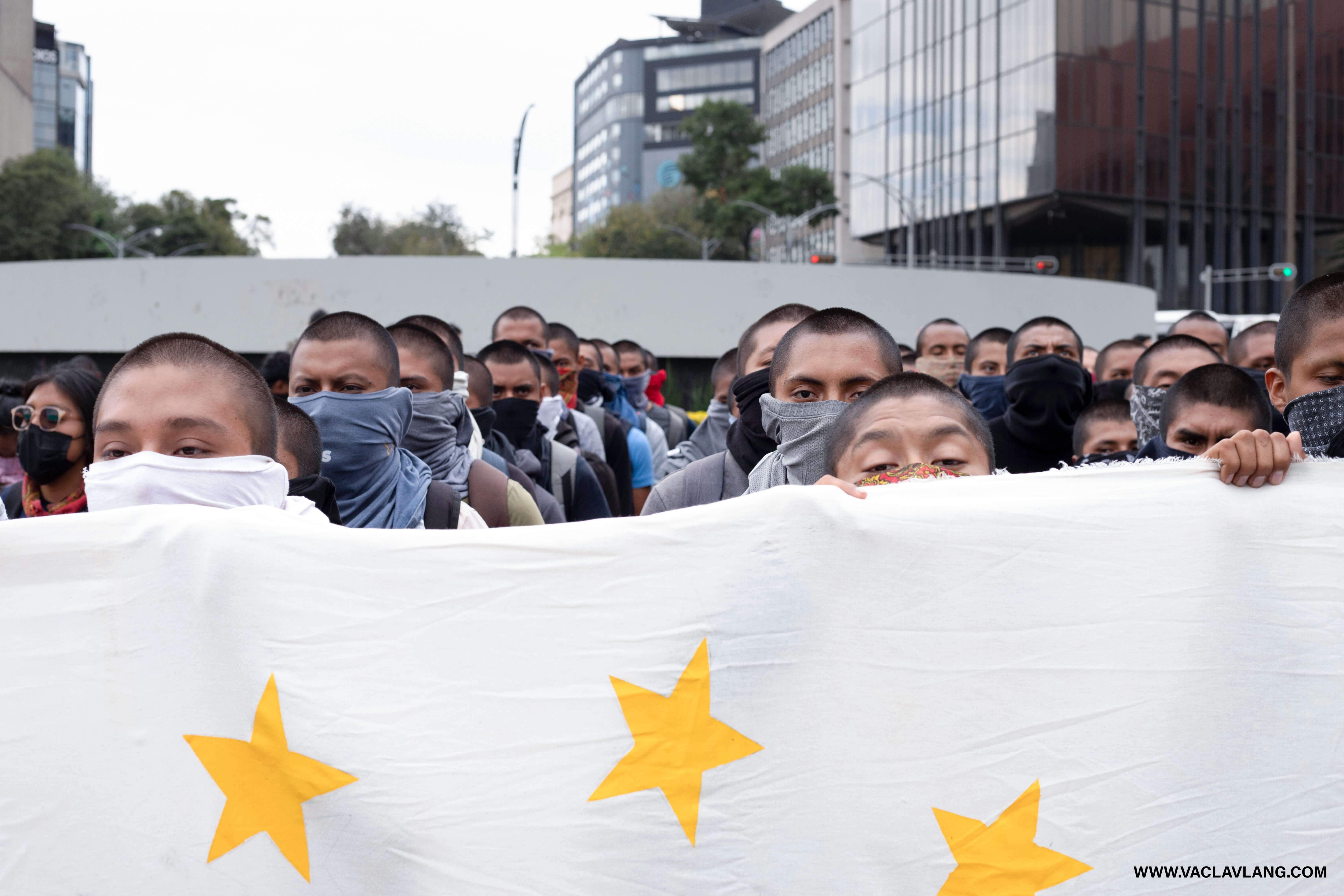 Podél bulváru parkovalo asi dvacet autobusů z Ayotzinapy a mládež s typickými šátky kolem krku nebo přes obličej si akorát dopřávala prostý oběd po povedené akci s výbušninami. Od jednoho z postávajících kluků jsem se dozvěděl, že další taková je naplánovaná na druhý den, tentokrát před budovou Úřadu generálního prokurátora ve čtvrti Doctores.